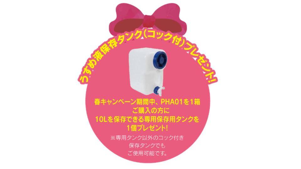 ●PHA01パウダー1本を10L程度の保存用タンクへ入れ、1~2Lの水道水を加えてよく溶かします。