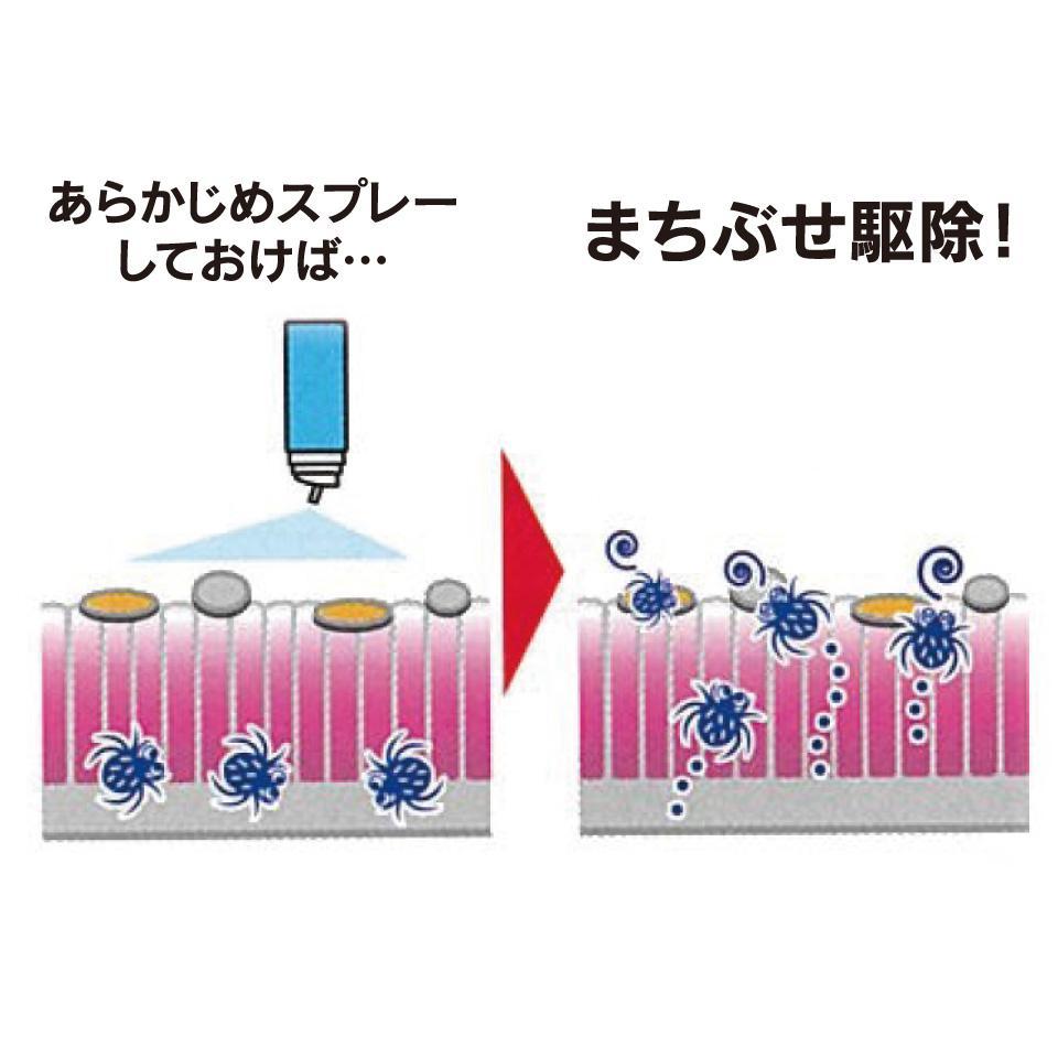 この習慣を応用!ダニがいそうな所や、ダニが気なる場所にあらかじめスプレーしておけば、表面に移動してきたダニが薬剤に触れ、効果的に駆除できます。効果は約1ヶ月間持続。