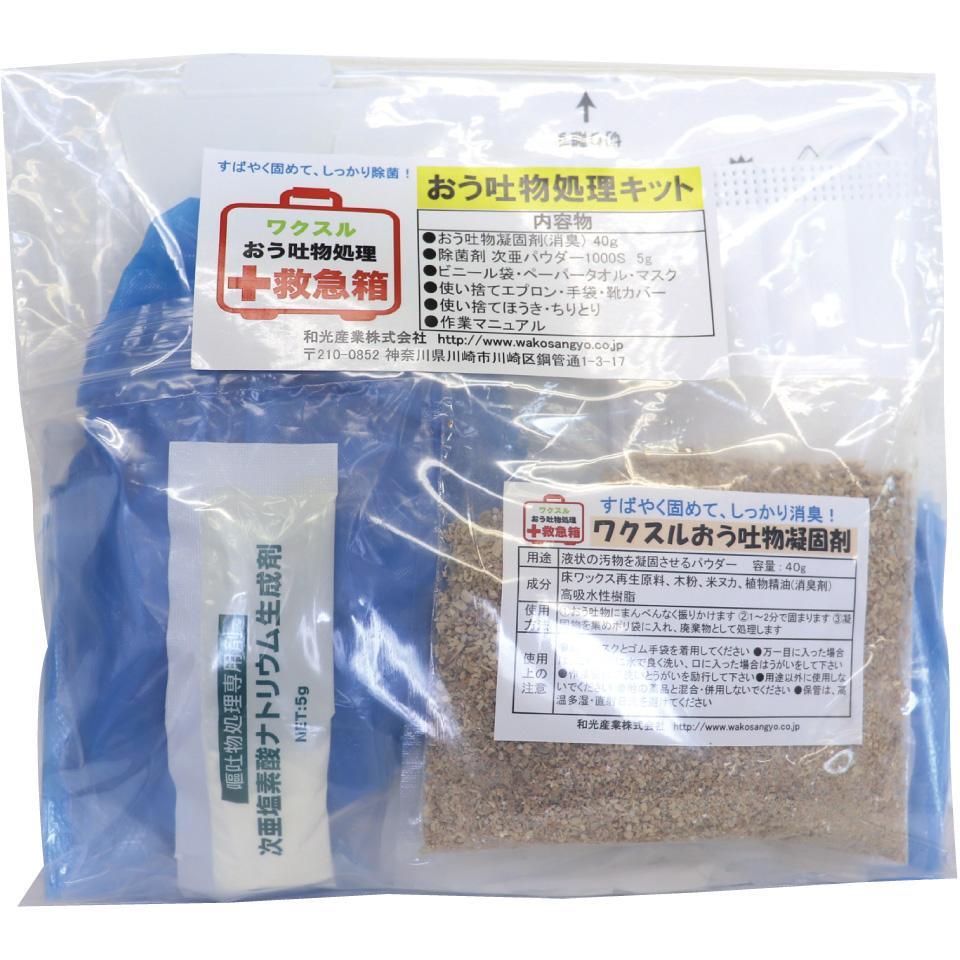 ● セット内容/おう吐物凝固剤(消臭)40g、次亜パウダー1000s 1包(5g)、ビニール袋、ペーパータオル、三層不織布マスク、使い捨てエプロン、プラスチック手袋、靴カバー、使い捨てほうき・ちりとり、作業マニュアル
