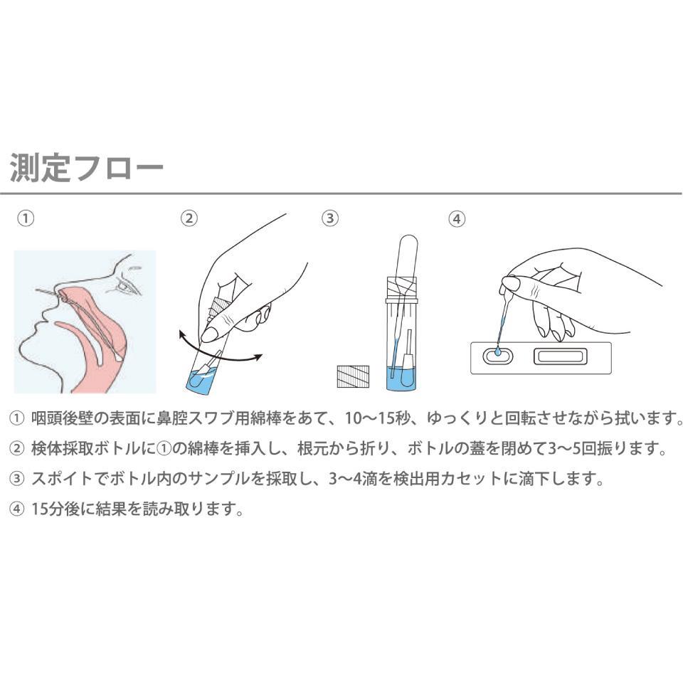 新型コロナウイルス抗原を特異的に検出できるイムノクロマトテストキットです。ヒト鼻咽頭に存在するSARS-CoV-2の特定核タンパク質抗原を15分で判定します。