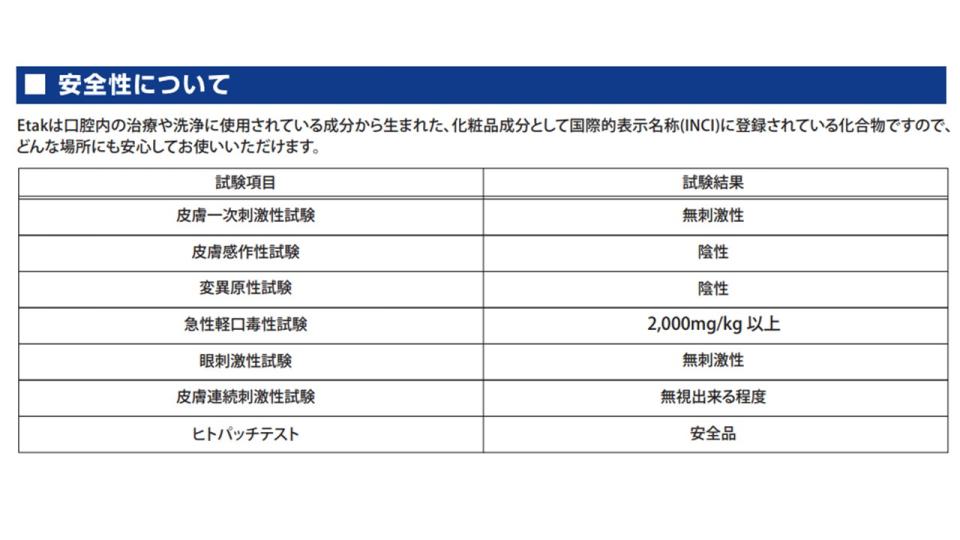 各種試験結果より、皮膚への刺激性・経口毒性などの安全性が